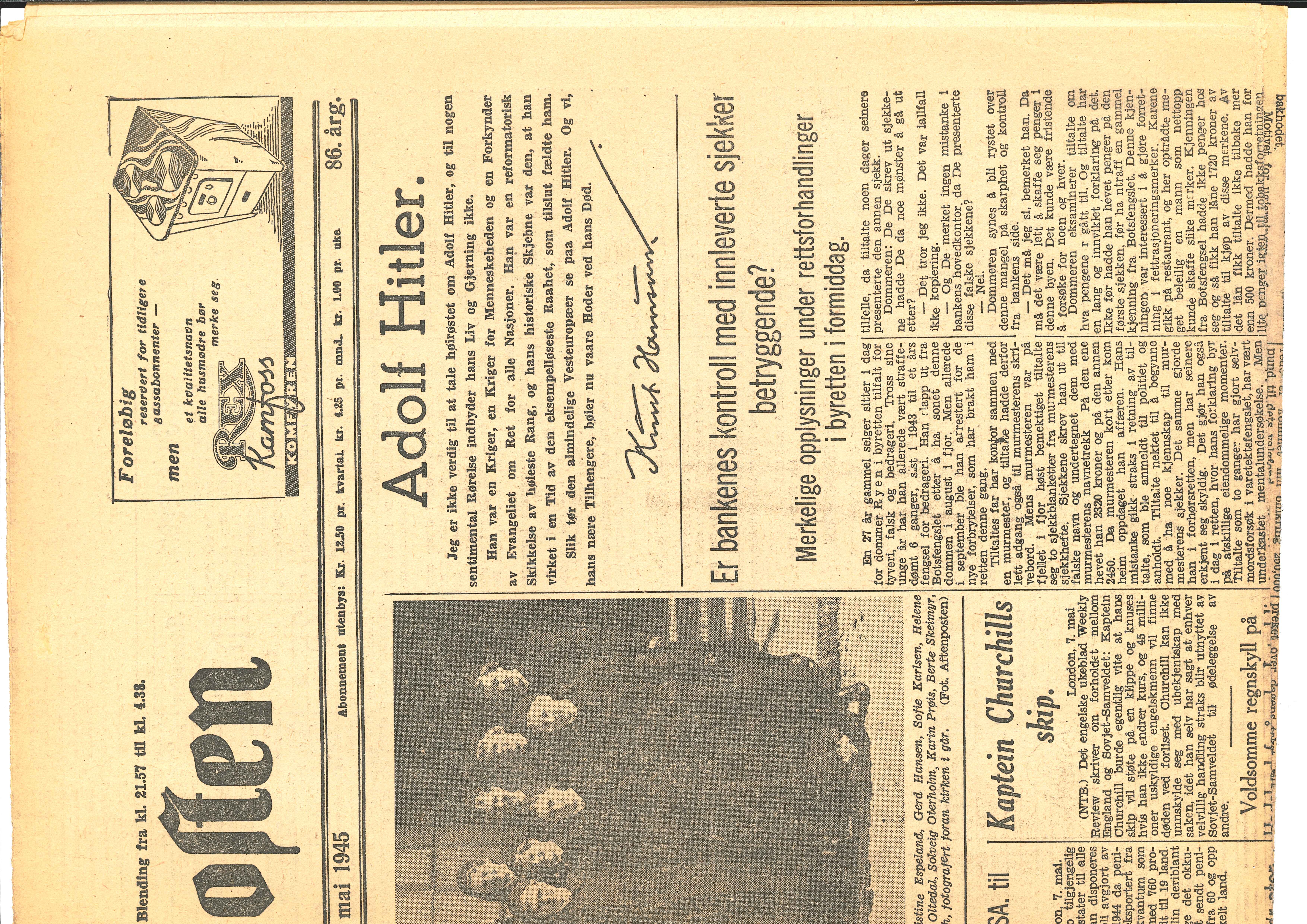 Knut Hamsun støttet «den store sak» under andre verdenskrig og beundret Adolf Hitler til det siste. Det materialiserte seg blant annet i en nekrolog i Aftenposten på den siste krigsdagen, 7. mai 1945. Den lød slik: