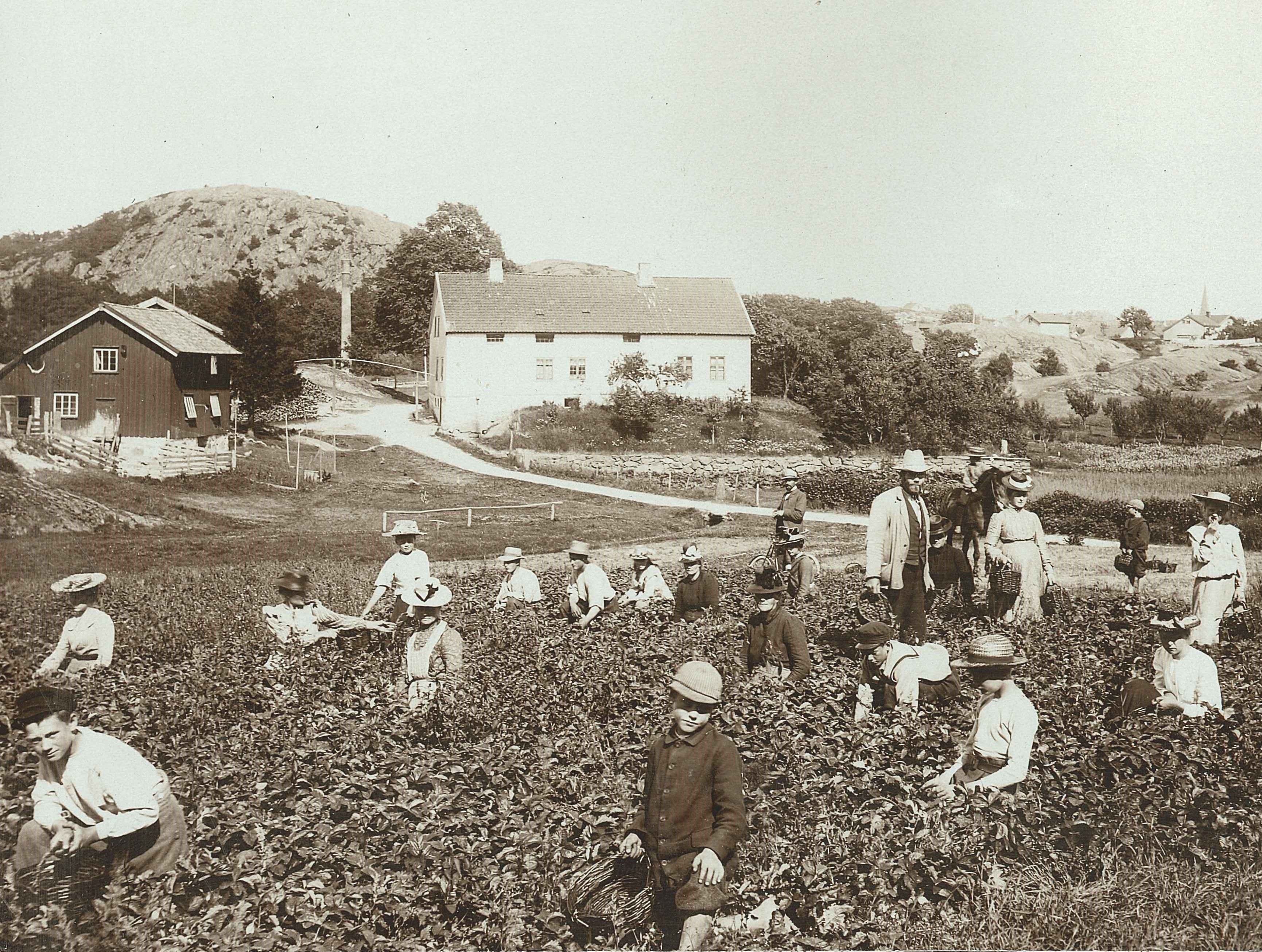 Ivar Beisland i jordbæråkeren på Berge Gård. Legg merke til alle pilekurvene på bildet. Ivar Beisland kom hjem fra Australia rundt 1889 med nye ideer og startet opp med bærproduksjon, spesielt jordbær. I flere år sendte han hundrevis av kilo med jordbær til Oslo med båt om kvelden. Neste morgen var jordbærene klare for salg på torvet.